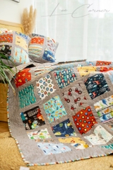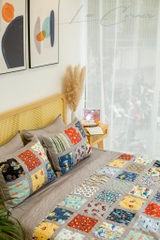 Set chăn gối ghép vuông phức tạp của nhà LEE CORNER được hình thành từ các mảnh vải tưởng chừng như không liên quan đến nhau thành một mảng hài hòa về màu sắc và bố cục.
