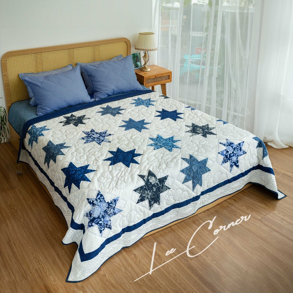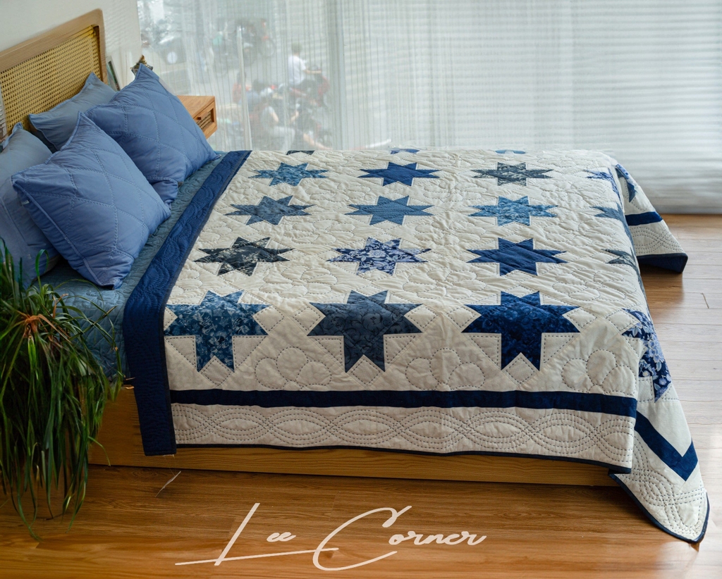 Chăn ghép ngôi sao, chần tay kích thước 2x2,2m là một kiểu ghép đặc biệt, các ngôi sao mầu xanh lục được ghép đối xứng nổi bật trong nền trắng. Đặc biệt hơn nữa là sự kết hợp của kiểu chần tay bông hoa đẹp mắt. Các đường chần và hoạ tiết chần đều răm rắp được làm bởi người thợ lành nghề nhất của nhà Lee Corner.
