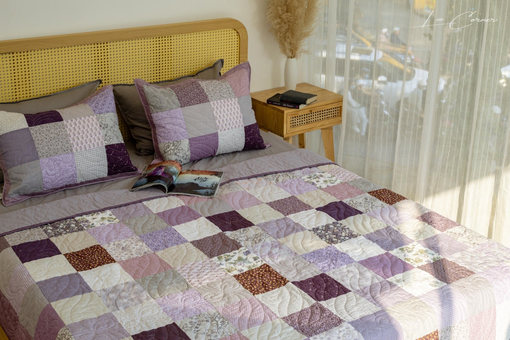 Set chăn gối ghép vuông của nhà LEE CORNER được hình thành từ các mảnh vải tưởng chừng như không liên quan đến nhau thành một mảng hài hòa về màu sắc và bố cục.