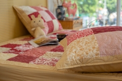 Set ga gối ghép vuông đỏ be của nhà LEE CORNER được hình thành từ các mảnh vải tưởng chừng như không liên quan đến nhau thành một mảng hài hòa về màu sắc và bố cục.
