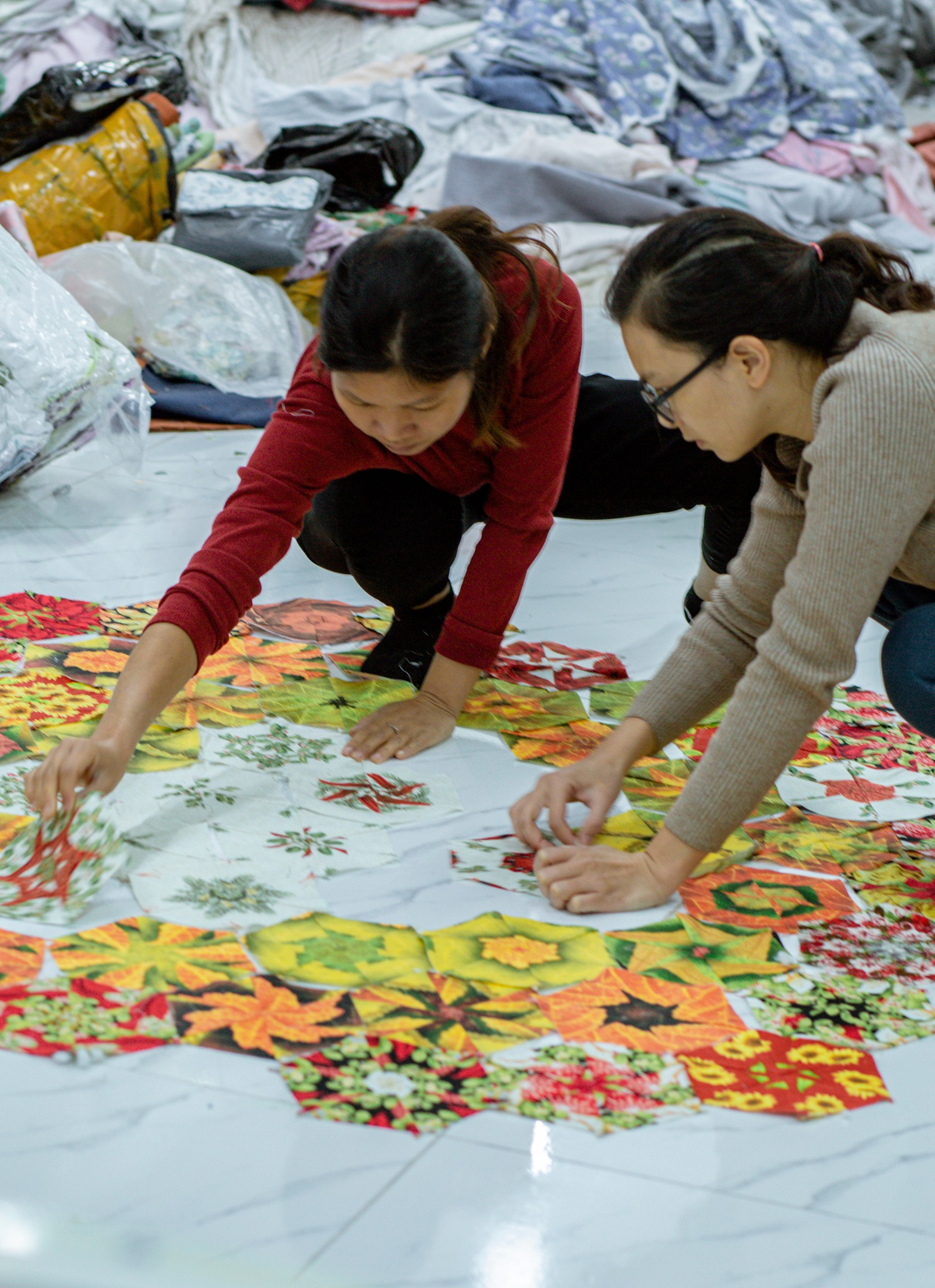 Đối với kiểu ghép này thì công đoạn khó nhất chính là lựa vải đấy ạ. Chiếc chăn trong hình được em “săn lùng” vải đến 4-5 tháng mới siêu tập đủ vải ưng ý.